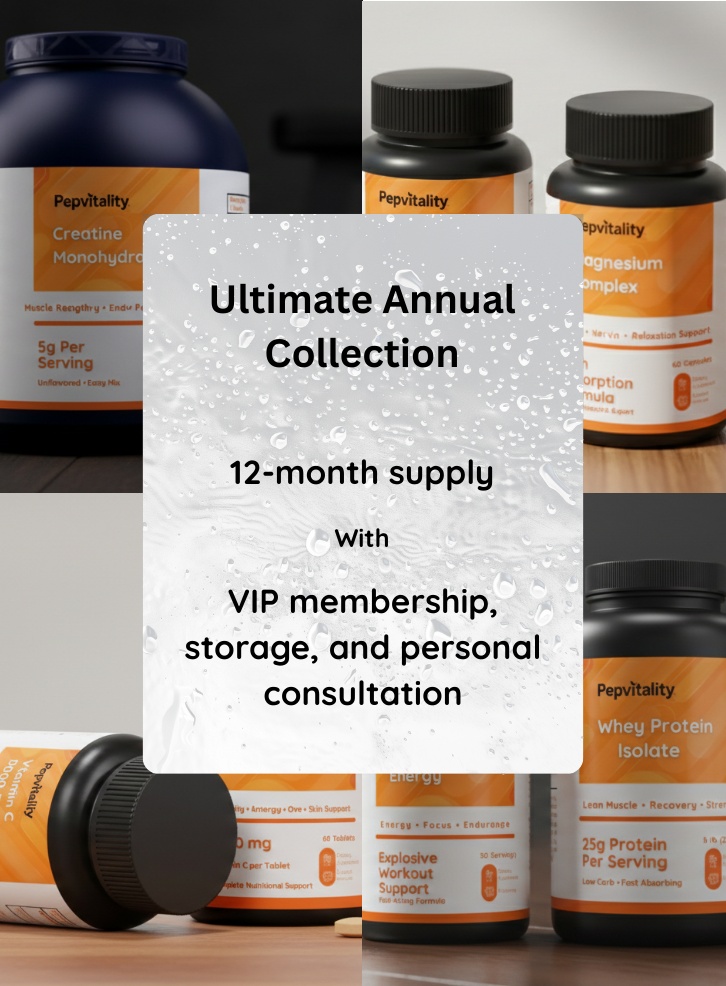 The Ultimate Annual Collection delivers a full 12‑month supply of premium wellness essentials, complete with VIP membership benefits, a durable storage system, and personalized consultation your all‑inclusive path to year‑round health and performance.